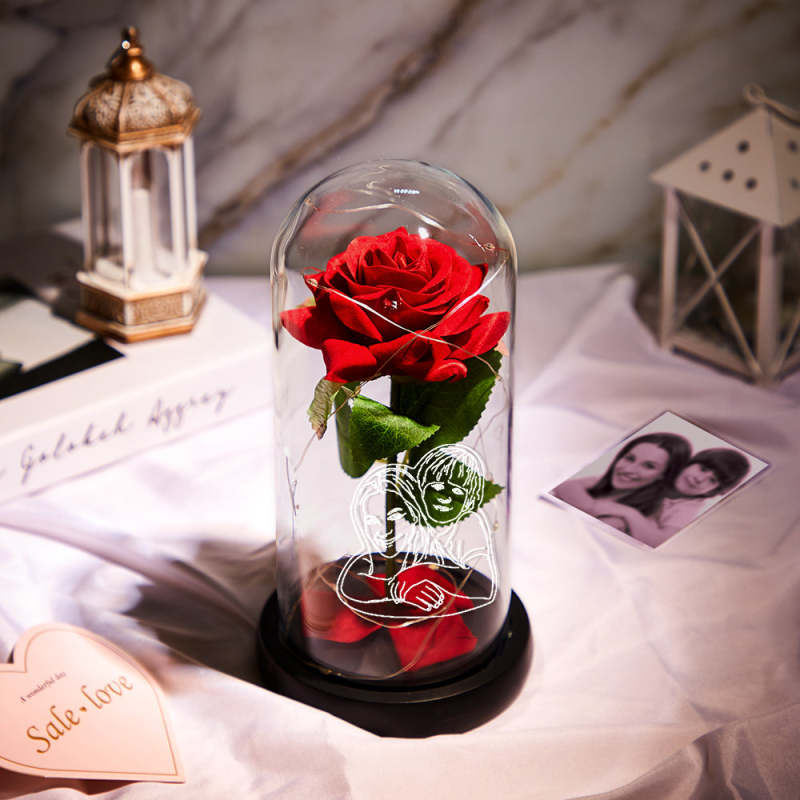 Custom Photo Line Drawing Eternal Rose Flower LED Night Light Romantic Simulation Eternal Rose Flower Glass Cover for Anniversary and Mother's Day